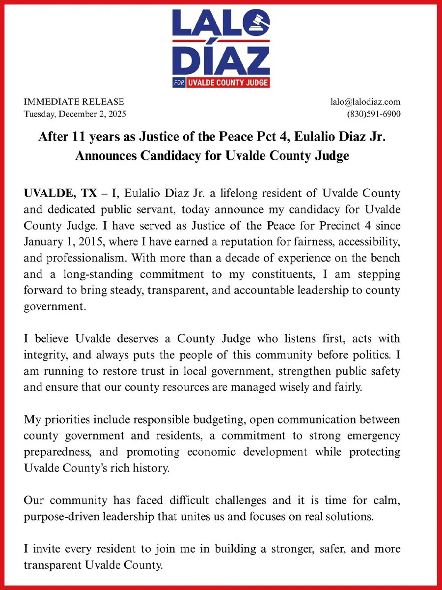 Eulalio “Lalo” Diaz Jr. is a lifelong resident of Uvalde County and a dedicated public servant with more than a decade of experience on the bench.